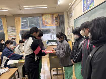 今朝、1・2年生から3年生へ手作りの合格御守を贈りました。この御守りを持って受験をのりきり楽しい高校生活を送って欲しいですね。