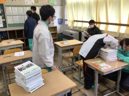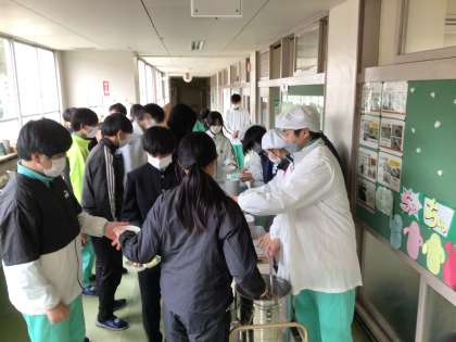 期末テストが始まりました。3年生は最後の定期テストです。2年生は課題を集める様子、1年生は給食配膳の様子です。あと2日力を出し切って週末を迎えましょう。ちなみに1年生の給食準備の速さはピカイチですよ。
