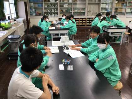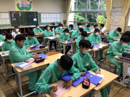 授業に変わりましたが、どの学年も集中して取り組んでいます。1年生では、音楽の授業で校歌のテストを行い、1人でも堂々と歌う姿が見られました。2年生では、国語の授業の振り返りの場面で一人一人がしっかりと自分の意見を書いていました。3年生では、理科の授業の中で積極的に意見交換をする場面が見られました。