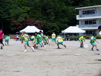 プログラム2「ごへいもち、いくつできるかな」。これもまた下山地区ではお馴染みの競技です。グラウンドに置かれた五平餅の色を自分たちのチームの色(茶or白)にどれだけ変えることができるかを勝負します。競技が終了したときに、自分たちのチームの陣地に戻っていないと減点されるというルールを新たに加えましたが、減点覚悟で五平餅をひっくり返す選手を数名つくるといった、各団の作戦が見られました。