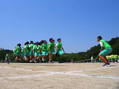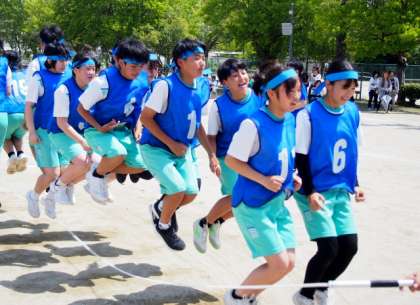 プログラム3「長縄跳び」。本校の長縄跳びは、4分の間に合計何回跳ぶことができたかで勝敗を決めます。当日に向け、生徒たち、そして、教員も、どうすれば回数を増やすことができるかと練習を進めてきました。4分の長縄跳びの時間が進むにつれ、各団の声が大きくなり、全員の気持ちが一つになっていく姿が印象的でした。