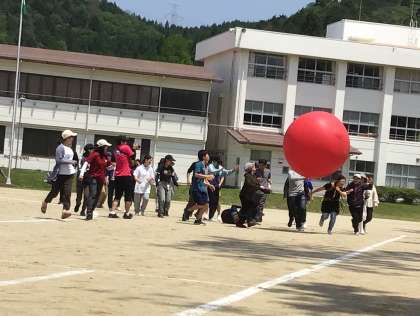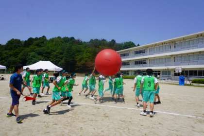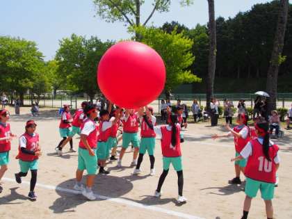 プログラム4「大玉送り」。直径約1.5mの大玉をスタート地点からゴール地点まで、各団で協力して運動場半周分の距離を手渡ししていく競技です。これも新競技です。ただ大玉を運ぶだけと簡単に思うかもしれませんが、この大玉が言うことを聞きません。最後に優勝した団と教員・保護者連合チームで勝負をしました。教員、保護者の言うことも聞かない大玉でした。