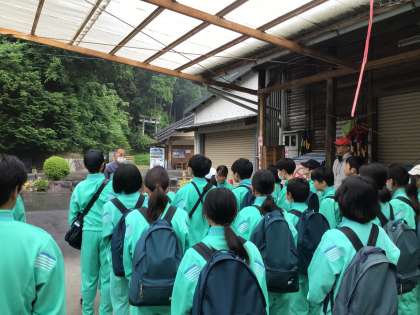 今日は、1年生が地域学習に出かけています。最初に森林組合を訪れました。森林組合の方に講習をしていただき、業務内容やどのような森づくりをしているのか伺いました。生徒たちは、メモをとりながら下山の森づくりに関心を深めていました。
