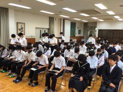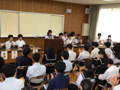前期生徒総会が行われました。各委員会と生徒会役員からの提案を受け、全校生徒で話し合いました。提案された取組を通して、生徒にとって過ごしやすい下山中学校に変わっていくのが楽しみです。