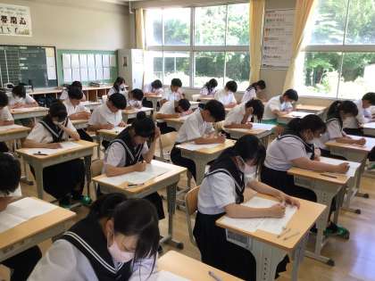 3年生では、豊田市内統一の学習診断テストが行われました。これまでの学習の成果を確認するとともに、テストの結果を受けて、進路選択の判断材料の一つにしてもらいたいです。テストを受けている3年生からは、受験を意識した取組が伝わってきました。
