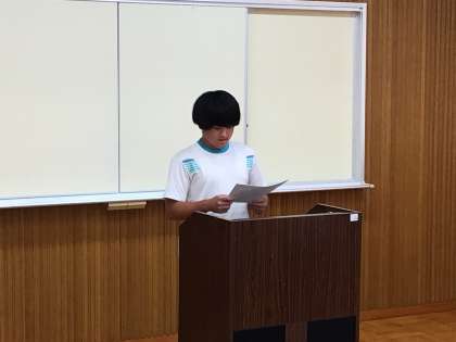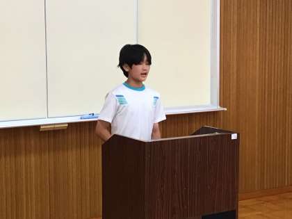 夏休み前の全校集会を開き、文化面や運動面の表彰、各学年の代表生徒の意見発表、校長先生のお話を行いました。表彰では、これまでのがんばりや取組が賞という形で認められました。意見発表では、どの生徒もこれまでの生活を振り返り、明日からの夏休みや今後の生活でがんばりたいことを堂々と発表してくれました。校長先生からは、夏休みという誰にも与えられたChanceを生かし、何かにChallengeし、新しい自分にChangeしようとお話がありました。仲間の姿や校長先生のお話を受け、9月1日に一回り成長した姿の下中生に再会できることを楽しみにしています。