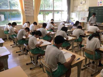 本日、明日と前期期末テストになります。これまでの学習の成果と確認、夏休み中の努力を試す機会です。どの生徒も集中し、時間いっぱい解答していました。特に3年生は受験を意識し、見直しまでしっかりと行う様子が見られました。