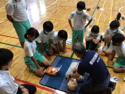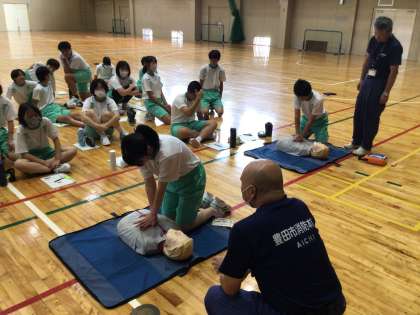 2年生では、足助消防署の方に来ていただき、心肺蘇生法講習会を実施しました。現在は、誰もがAEDを使用してもよいとなっています。大切なのは、人を救うための一歩を踏み出す勇気とAEDの正しい使い方や胸骨圧迫(心臓マッサージ)の仕方を身に付けていることと学びました。万が一のとき、今日学んだことを勇気をもって行動にうつしてほしいです。