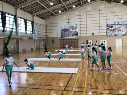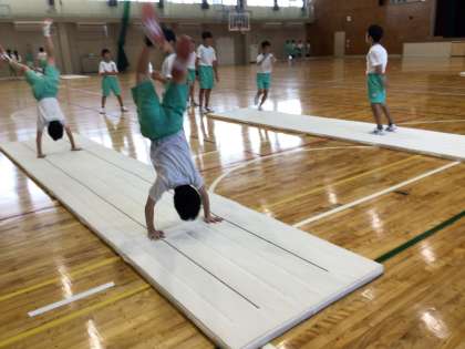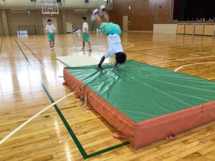 本日の1年生体育の授業では、以前学校ホームページでも紹介した動物の動きを表現する運動だけでなく、前転や後転、倒立なども行いました。様々な技に一生懸命取り組む姿が印象的でした。特に前方倒立回転跳びを少し練習しただけで成功させてしまう生徒には驚かされました。また、他の生徒も負けじと側転や倒立、倒立前転の練習を取り組んでいる姿も大変気持ちのよいものでした。