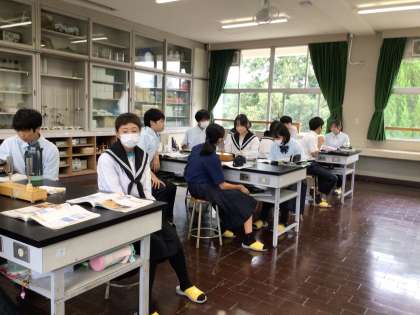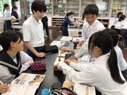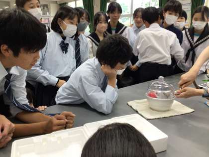 今日の理科の授業では、音の伝わり方について学びました。音が伝わる現象は目に見えない事象ですが、実験という目に見える形で確かめました。驚いて感嘆の声を上げる生徒の姿が印象的でした。特に、音が空気を伝わって届くことを確かめる実験では、ドーム状の機械の中でブザーを鳴らし、その機械の中の空気を抜き真空にします。真空にすると、ブザーの音は聞こえなくなります。生徒からは、「なんで?なんで?」「どうして鳴らないの?」「さっきまで聞こえていたのに」という驚きや疑問の声が飛び交いました。理科は不思議でいっぱいです。