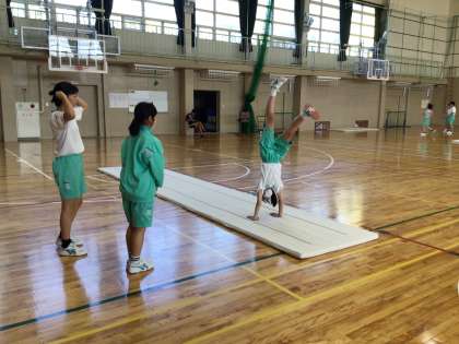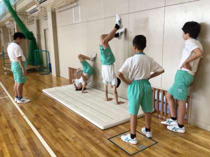 今日の体育の授業では、マット運動を行いました。実技テスト前、最後の練習をする時間でした。大技の前方倒立回転跳びをひたすら練習する生徒たちの姿が見られました。前回の体育の授業のときに失敗していた生徒が今日の授業では、何度も成功させている姿が印象的でした。他にも、できない技をできるようになりたいという一心で壁倒立に何度も挑戦する生徒の姿は元気がもらえました。練習の成果が発揮できるのか、次の体育の授業が楽しみです。