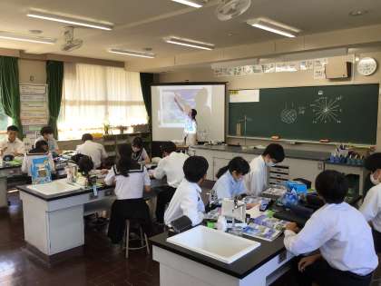 2年生では、理科の授業で気象要素と天気の変化の関係について学習していました。なぜ雲が発生するのかなど、普段の生活の中で起こっていることについて根拠をもとに理解をしていました。