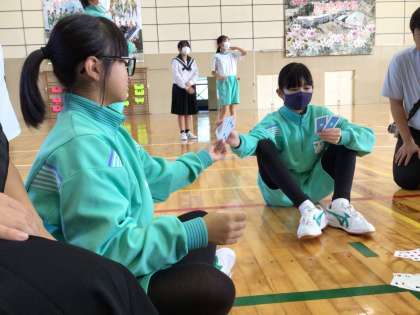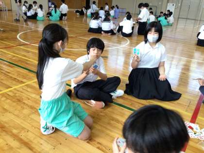 今日は生徒会が企画したレクリエーションでババ抜きを行いました。4つの団がそれぞれ4つの班に分かれ、ババ抜きを行った結果、ババ抜き最強・最弱が決まりました。前日から先輩とのババ抜きに闘志をみなぎらせ、「俺が最強になる」「いや、俺がなるんだ」と先輩たちとの勝負に意気込む生徒の姿が印象的でした。他学年とのレクリエーションに盛り上がる生徒たちの姿は大変気持ちのよいものでした。普段あまり会話をする機会がない生徒同士が楽しそうに交流したり、普段は賑やかな生徒が先輩の前では少し緊張した様子を見せたり生徒たちのさまざまな一面に触れることができました。