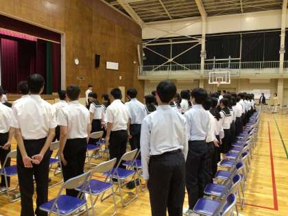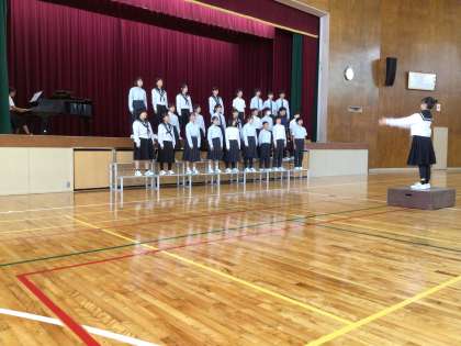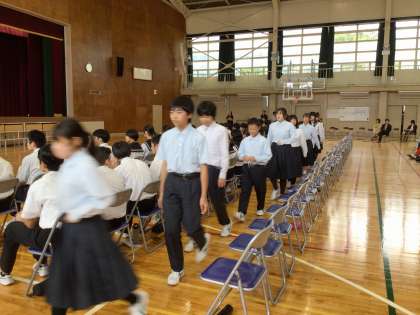 5時間目に行われたプレ文化祭では、1年生がトップバッターを務めました。ひな壇へ移動する生徒たちの表情には緊張が見えましたが、歌い始めると徐々に表情がやわらぎ、次第にいつもの1年A組らしい歌声が響き渡りました。