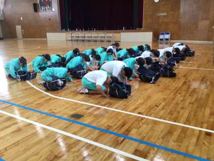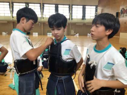 今日の体育の授業では、剣道を行いました。初めての剣道の授業では、防具を身につけることに20分以上かかっていた生徒たちですが、今日の授業では10分程度で身につけられるようになりました。うまく防具が身につけられない生徒には他の生徒が手を貸す姿もあります。