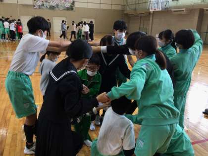 最初の活動は「人間知恵の輪」です。児童と中学生が手を取り合い、複雑に絡み合った輪を解こうと協力し合いました。中学生は「ここをくぐって!」「手を上げて!」と声を掛けながら、優しくアドバイスをしていました。児童も「できた!」とうれしそうな表情を見せていました。