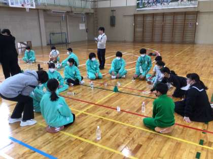 最後の活動は「ボトルフリップ」です。ペットボトルを一斉に投げる瞬間、みんなで「せーの!」と声を合わせ、成功したときには笑顔が広がりました。