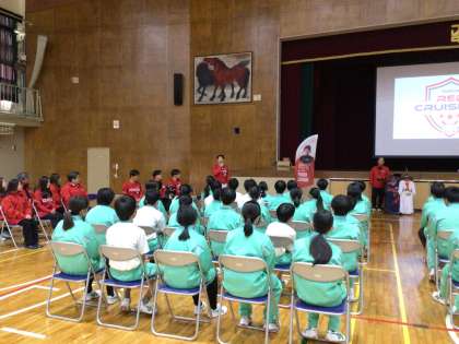 本日、「LEXUS & GR チャレンジ Lab@下山中」を実施しました。トヨタ自動車硬式野球部RED CRUSERSに所属する福井章吾選手をはじめ4名の選手とToyota Technical Center Shimoyamaの方をお迎えし、特別授業を行なっていただきました。
