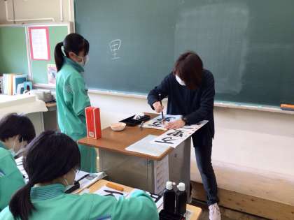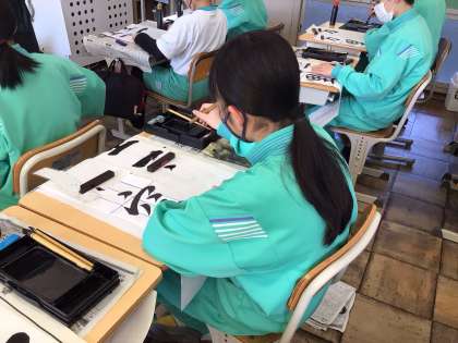 本日、1年生は書写の授業を行いました。書道ボランティア講師の方をお招きし、ご指導をいただきました。生徒たちは心を落ち着かせ、真剣な表情で授業に臨んでいました。