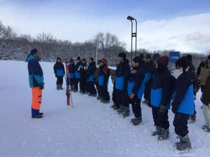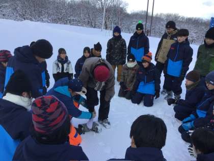 明日からのスキー研修に向け、 ブーツの履き方の講習です。