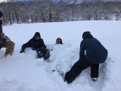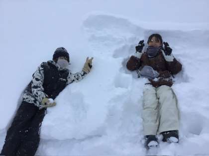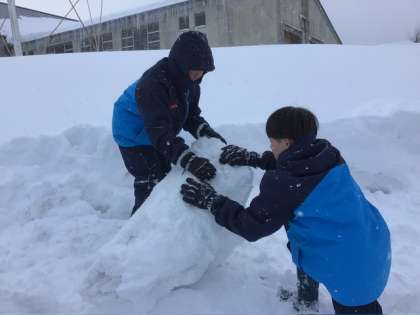 雪上レク 3時頃から雪が舞ってきました。 生徒も多くの雪に舞いあがっています。