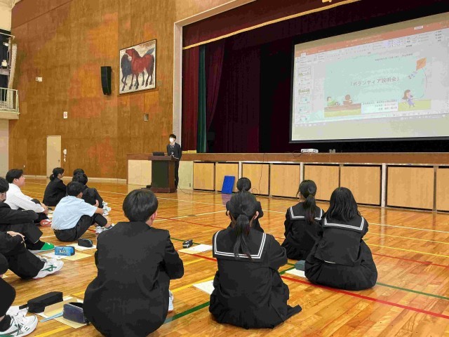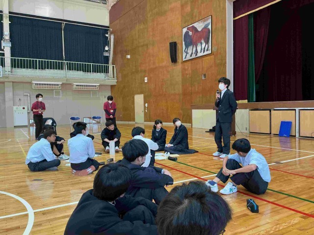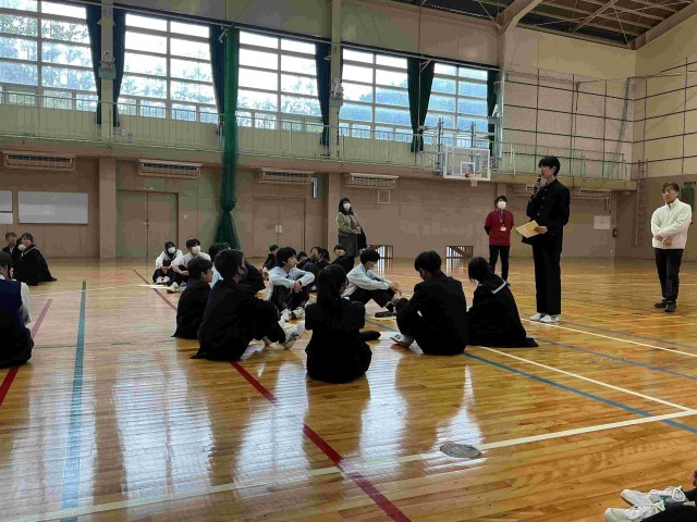 その後、体育館に移動し、縦割り班でのグループワークを行い、代表者が発表しました。