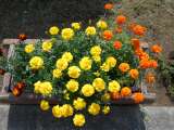 ロータリーのマリーゴールドが、プランターいっぱいに株を大きくさせ、たくさんの花...