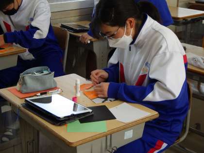 真剣な表情で紙をちきり、のりで貼って、パーツを作っています。細かい作業に苦戦しながらも、楽しそうに自分のパーツを作る様子です。