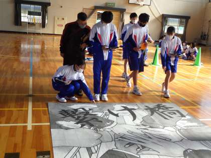 各教室で一人一人が作ったパーツを、体育館で繋げる様子です。