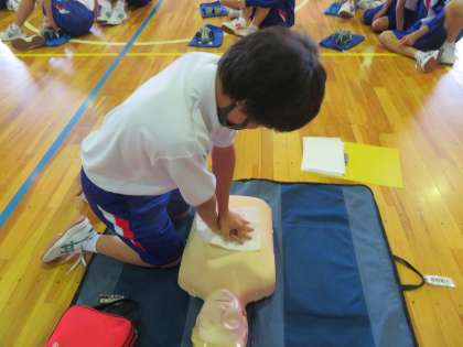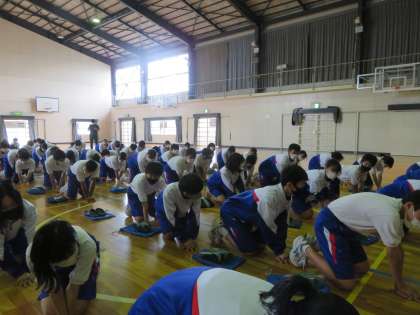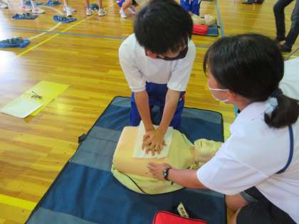 応急手当講習 公開日 2022/06/24 更新日 2022/06/24 お知らせ 6月21日火曜日、応急手当講習が行われました。 心肺蘇生のために重要な胸骨圧迫を行い、AEDの使用方法を学びました。 実際に緊急事態に遭遇した際には、今回身につけた知識を活かしていきましょう。