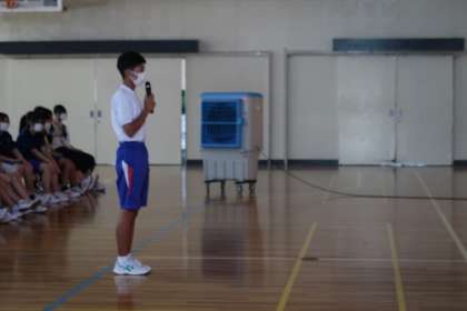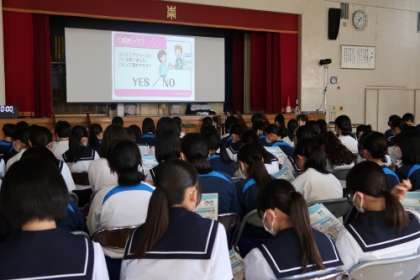 体育館で移動消費生活講座が行われ、中学生にも起こりうるトラブルとして、ゲームでの課金やネットショッピングについて、講習と笑劇派さんの劇で学びました。自分のことだけでなく、家族や高齢者の方にも注意喚起ができるように、これからの生活に役立てていきたいです。
