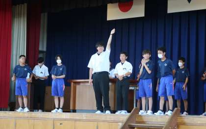 9/1(金)に全校集会と学年集会を行いました。全校集会では体育祭の縦割り団の抽選会をし、それぞれのクラスと縦割り団とカラーが決まりました。これから始まる体育祭の練習も始まるので、頑張ってほしいです。また、学年集会ではタケノコニョッキというレクをしました。これから普段の生活に戻るので、勉学や部活等に頑張って取り組んでほしいと思います。