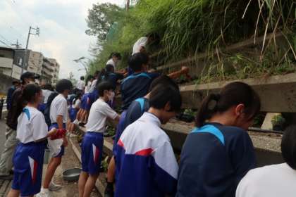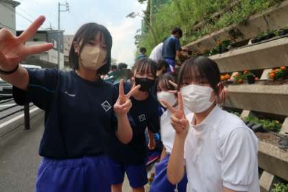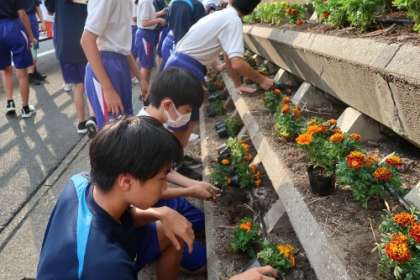 9/14(木)の業後にフラワーロードボランティアが行われました。全校から集まった有志で、マリーゴールドの花を1800株ほど植えました。蒸し暑い中でしたが、道に彩を添えるために元気に頑張ってくれました。誰かのために何かのためにボランティアができるのは素晴らしいことです。是非これからも続けてほしいですね。