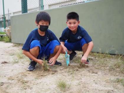 1年生は、力を合わせ、きれいなマリーゴールドを植え、その後、校庭の草抜きも行ってくれました。夏の間に伸びきった草で鬱蒼としていたグラウンドはすっきりし、フラワーロードはまた鮮やかになりました。