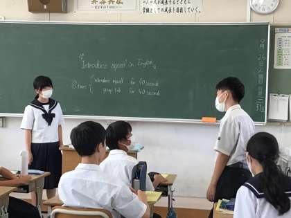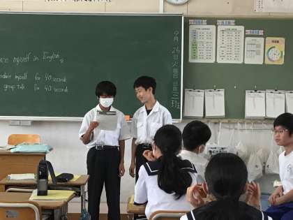 英語の授業で、自己紹介を英語で行いました。ある学級では、生活班で発表した後、自ら「みんなに発表を聞いてほしい」という声があり、発表をしました。うまく発音できない単語をクラスメイトにサポートしてもらいながら、はきはきと発表できました。
