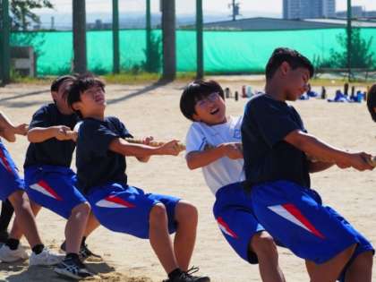 本日、綱引き予選を行いました。生徒たちは初めて全クラスと総当たりで対戦し、熱戦が繰り広げられました。学級一丸となり、団結力を高め、勝利のために頑張っています。