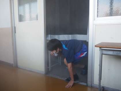 6限に災害について考えたり、疑似体験したりしました。どのような被害が出るのか、どのように身を守るのか考えたうえで、実際の火事を想定し、煙の中を進むという体験を行いました。煙を吸い込まないようにハンカチを口に当てたり、身を低くして進んだりしました。