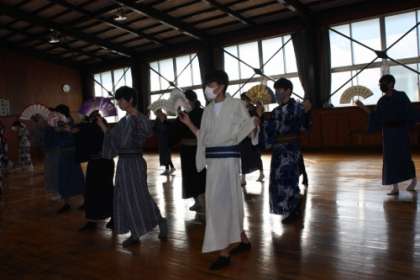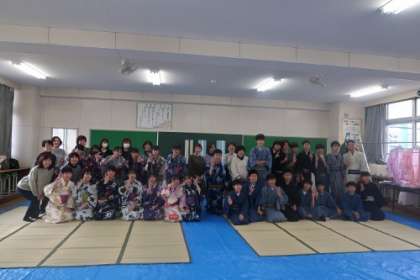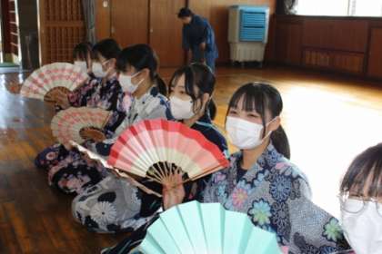 12/4(月)〜12/11(月)まで着付け体験と日本舞踊体験を行います。1時間目に浴衣の着付け体験を行い、2時間目に日本舞踊の体験を行っています。着慣れない和服を自分の力で着ることは難しいですが、講師の皆さんに丁寧に教えていただきながら着付けを行っています。日本舞踊では慣れない動きや、和服の動きづらさに苦戦しながらも、一生懸命取り組む姿が見られました。なかなか体験できないことなので、楽しみながら学んでほしいです。