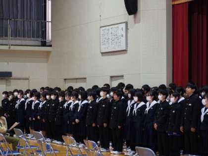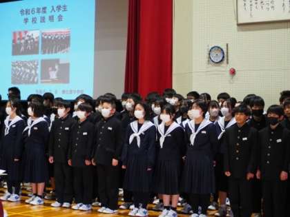 2/8(木) 1年生 校歌披露 公開日 2024/02/09 更新日 2024/02/09 学校生活の様子 本日、令和6年度入学説明会がありました。会の冒頭に、1年生から歓迎の意を込めて校歌を披露しました。 1か月近く、音楽の授業や朝読書の時間に練習してきた成果を発揮し、大きな歌声を披露できました。 6時間目には、新1年生が授業の様子を見に来ました。去年までよく顔を合わせていた後輩にかっこいい姿を見せることが出来ました。
