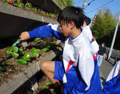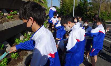 放課後に有志で集まった多くの生徒・保護者の方々で、本校横のフラワーロードの花を植えました。生徒たちは友達と協力しながら土を掘り、配置を考えて丁寧に植えていました。