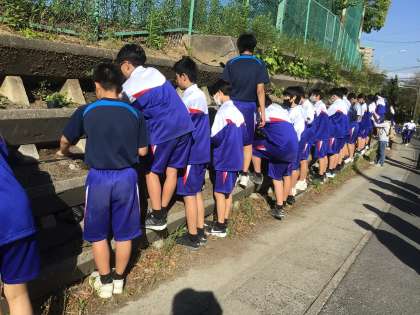麦の会のメンバーと、育友会ボランティアの方、そして各学年のボランティアの生徒たちが協力して、運動場南側土手にあるフラワーロードの花壇に花の苗を植え付けました。2年生は、約80名近くの生徒がボランティアとして参加しました。