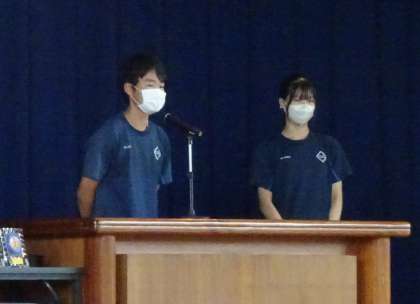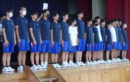 夏休み前日である本日、全校集会を行いました。夏の大会等の表彰伝達式では、全校生徒の前で誇らしげに報告をする姿や、それを見ている生徒たちも、仲間の勇姿に拍手を送っていました。