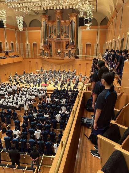 夏休み中に、豊田市コンサートホールにて行われた「心に残る記念事業」に参加しました。有名なクラシック曲を聴いたり、楽器一つ一つの音の紹介があったり、代表生徒が指揮者体験をしたりしました。終盤には、オーケストラに合わせて「翼をください」を合唱しました。オーケストラの演奏を生で聴いたことがない生徒も多かったため、大変貴重な心に残る思い出ができたのではないでしょうか。