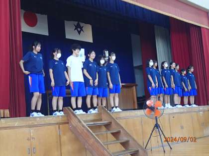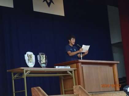 1時間目の全校集会では、夏の大会やコンクールの表彰と、代表生徒による抱負の発表がありました。これから後輩たちの模範となる行いをしたいという言葉通り、体育祭などの行事や日頃の生活で、見本となる姿を見せていきたいですね。
