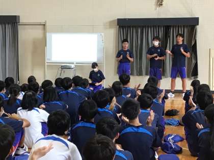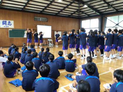 本日、体育祭での縦割り団の生徒が集まって、本番への機運を高める「結団式」を行いました。団長や各リーダーの紹介をしたり、団オリジナルの応援を披露したりして、交流を深めました。今回は、後輩たちに先輩としての目指すべき姿を見せる機会となりました。3年生が中心となって進めていく行事であるため、練習に取り組む姿勢や行動で、後輩たちを引っ張っていける集団でいたいですね。