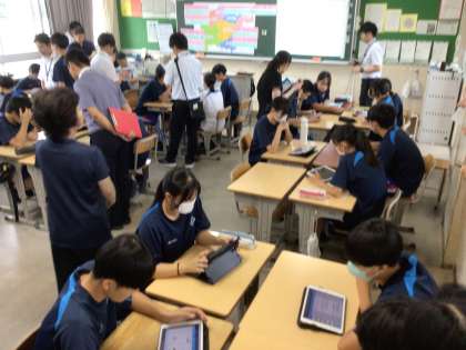 10月4日5校時に、2年3組にて安藤大智先生による社会科の研究授業を実施しました。今回の研究授業には、崇化館中学校の先生と豊田西高等学校の先生1名が参観されました。「もっとWE LOVE とよたにするには」をテーマに、授業を進めました。生徒たちは、学習用タブレットを活用しながら仲間たちと意見交換をしました。研究授業後、参観された先生方から授業に取り組む姿勢について高い評価をいただきました。