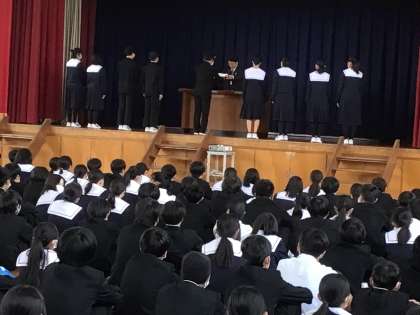 先ほど令和6年度修了式及び生徒会執行委員認証式を行いました。各学年代表1名が登壇し、校長先生から修了証を受け取りました。また生徒会執行委員認証式では、先日の生徒会選挙で選出された生徒が登壇し、校長先生から一人ひとり認証状を受け取りました。
