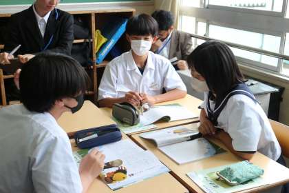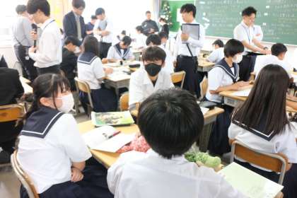 現在本校では、「対話」を意識しながらユニバーサルデザイン化された授業を推進しています。今回の授業でも、誰でも取り組みやすい「見つけ学習」や、話し合いに適した「T隊形」を取り入れていました。生徒たちは、少人数での話し合いに積極的に参加し、自分の思いを共有していました。