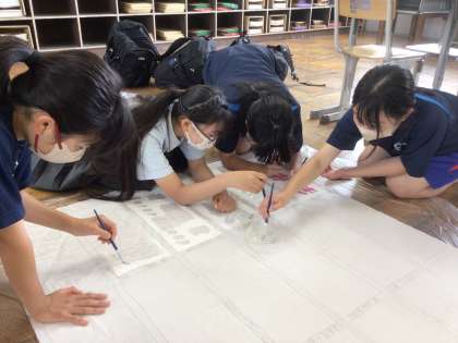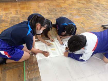 1年生 6/13(金) 学年旗を製作中です 公開日 2025/06/17 更新日 2025/06/17 学校生活の様子 登校してから朝の会までの時間や給食後から5限までの放課の時間を使って、有志で学年旗を製作しています。生徒からのアイデアをもとに出来上がった学年のシンボルマークと各学級の級訓が描かれています。どんな学年旗が完成するのか楽しみです。