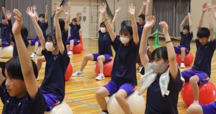 学校保健委員会では、自律神経を整える大切さに関するお話があったうえで、バランスボールを使った活動を行いました。バランスボールで跳ねながら行う鬼ごっこでは、普段使わない筋肉を使って運動することで交感神経を刺激し、バランスボールを使ったストレッチでは、リラックスすることで副交感神経を刺激しました。自律神経の大切さを体験的に学ぶことができ、楽しそうに活動する生徒たちの姿がありました。
